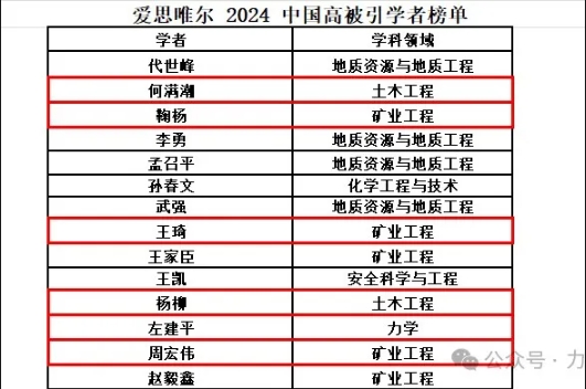 星空官网岩土工程和工程力学老师何满潮院士、鞠杨教授、周宏伟教授、左建平教授、王琦教授、杨柳教授6名学者入选。