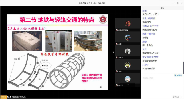 采用腾讯会议平台,效果很好,基本没有卡顿现象。上课前,微信群里通知下载腾讯会议并调试,确保所有同学可以熟练使用操作软件。正式上课前20分钟创建新的会议室,并在微信群里邀请学生加入。在微信群里告知授课时间并提前发送PDF版课件。课堂上,学生可以选择聊天实时发送信息(或配合微信群)。授课过程中,学生反映信号较好,无卡顿现象。课后,学生有任何问题,腾讯视频是一种比较好的线上授课手段。