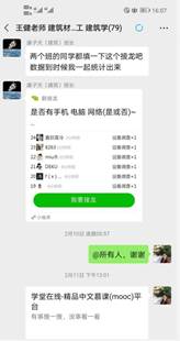 网络教学手段虽然比较成熟,但是对于我和很多的同学们来说, 还是第一次。为了了解同学们在家里所拥有的网络资源和上网方式,我首先尝试通过微信建群的方式,把上课的同学们都加入到这门课程的班级群里,欣慰的是所有同学都可以使用微信联系到,这样为硬件准备具备了一个坚实的基础,并实现了沟通保障。同时督导组的老师也顺利的加入。接着就是通过接龙程序,统计得出了同学们在家里所拥有的网络资源和上网方式,结果是所有同学都可以上网和使用手机,只有2个同学没有电脑。根据这样良好的状况, 我决定使用直播的方式授课,使大家进入有规律的作息和学习。