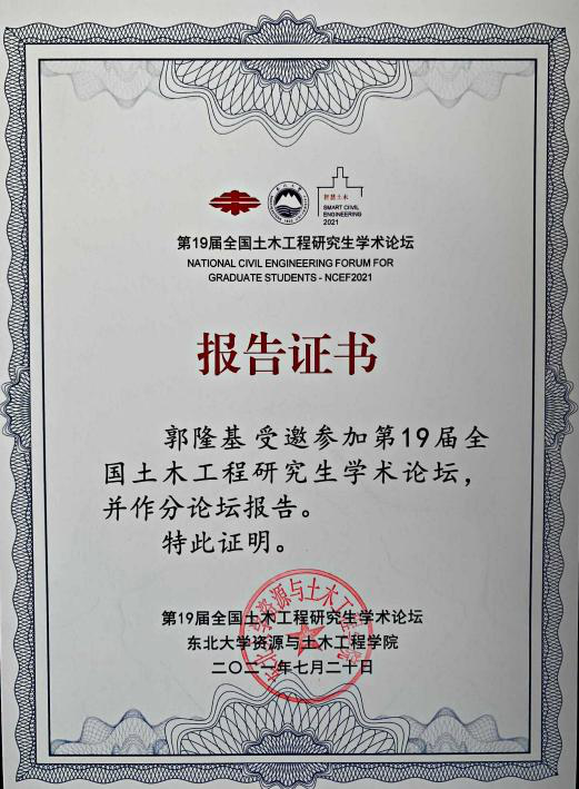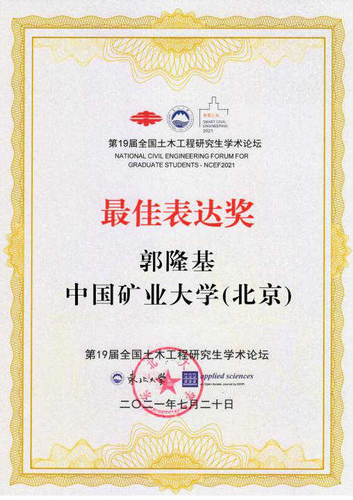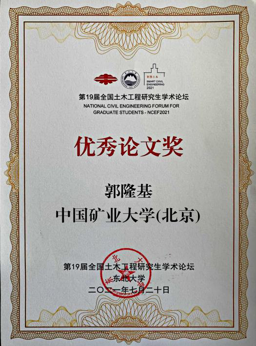 最终星空官网郭隆基博士在同济大学、浙江大学、吉林大学等一众知名985高校博士、硕士中脱颖而出,获得“最佳表达奖”(全国仅8个)、“优秀论文奖”,且“NPR锚杆/索围岩动力响应及工程应用”相应论文被推荐至《东北大学学报(自然科学版)》(全国仅18篇)。