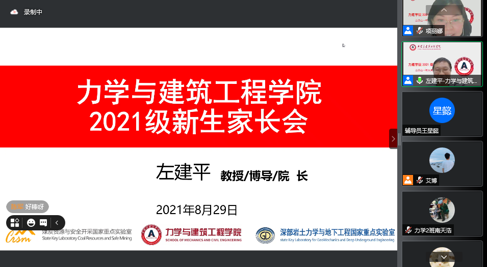 院长左建平介绍了学校、学院历史沿革和发展历程,就师资队伍、科学研究、学科建设、校园文化等多方面内容作了报告,同时也从学生培养、国际学术交流等方面展示了星空官网对学生基础知识、科研能力和创新意识的培养。他表示,经过一代又一代矿大人的努力奋斗,学校形成了“明德至善、好学力行”的校训,铸就了中国能源工业高等教育的一流品牌和独特的精神文化品格,矿大有能力有信心培养好新一届学生,希望家长放心,并寄语广大新生要为努力建设世界一流能源科技大学贡献青春力量。