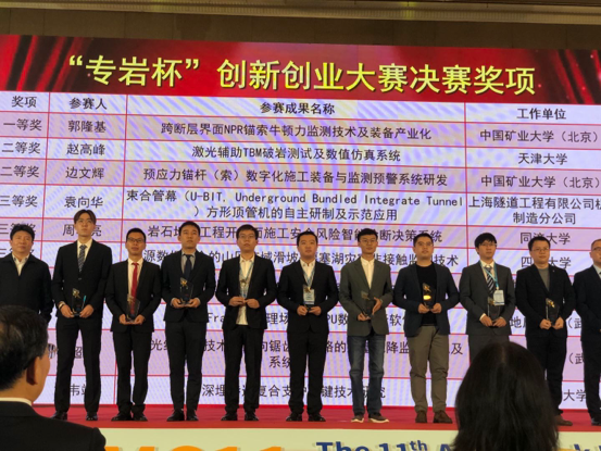 选手经过决赛项目演讲、评委提问和选手答辩、评委打分、观众投票四个环节,最终决出一等奖一名,二等奖两名,三等奖五名,优秀奖两名。在学校与力建学院及深部岩土力学与地下工程国家重点实验室统一安排下,积极组织学生参赛,分阶段多批次对参赛项目进行辅导。最终由何满潮院士、陶志刚副教授指导的博士研究生郭隆基等负责的“跨断层界面NPR锚索牛顿力监测与控制技术及装备产业化”项目获得全国一等奖,由杨军教授、王琦教授指导的博士研究生边文辉等负责的“预应力锚杆(索)数字化施工装备与监测预警系统研究”项目获得全国二等奖。