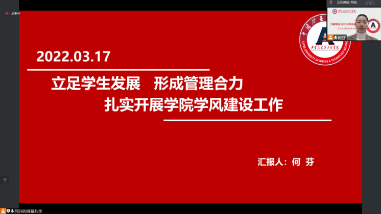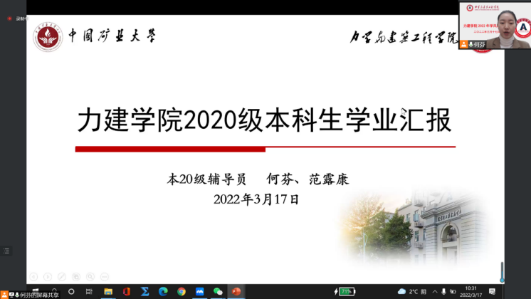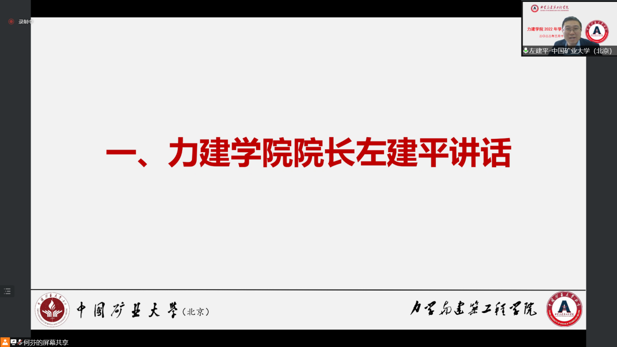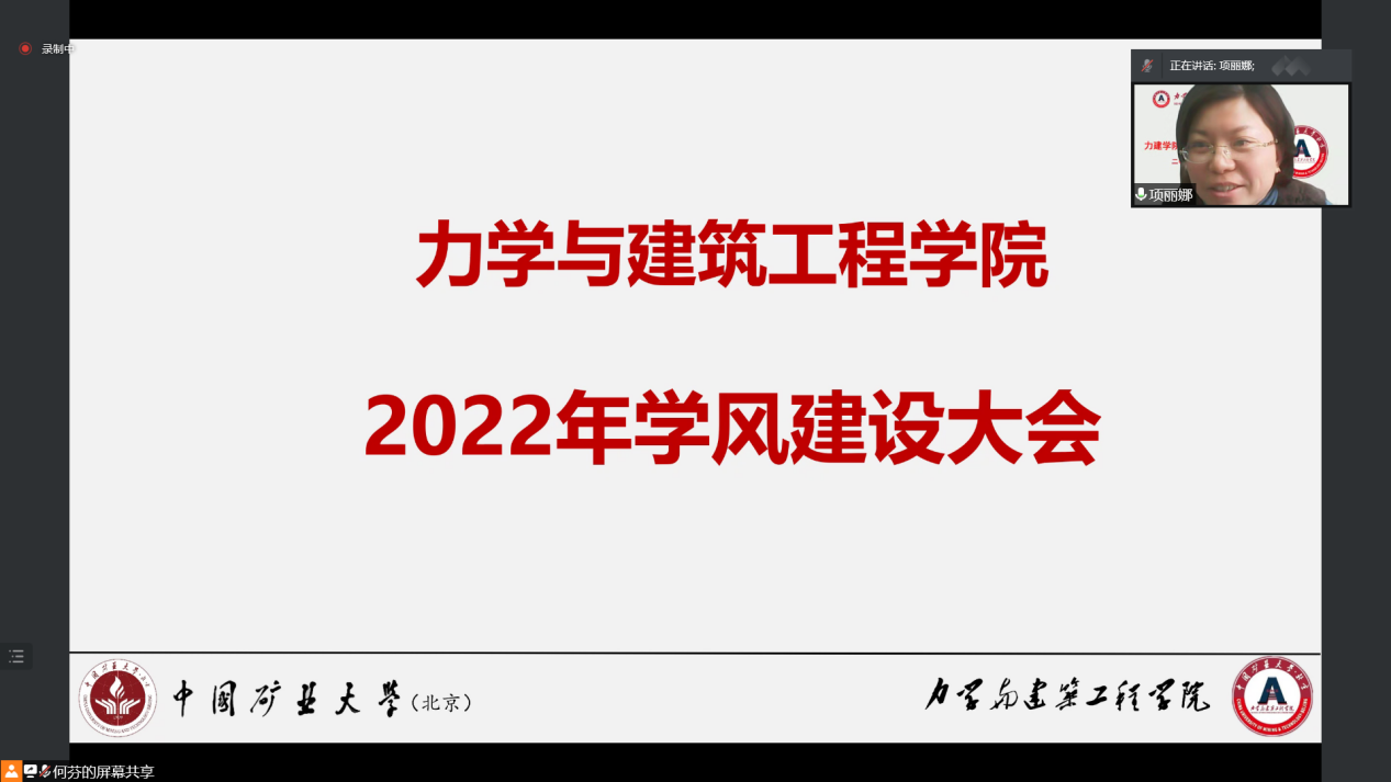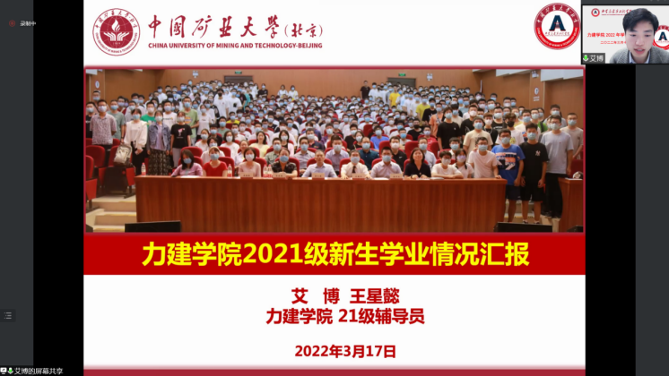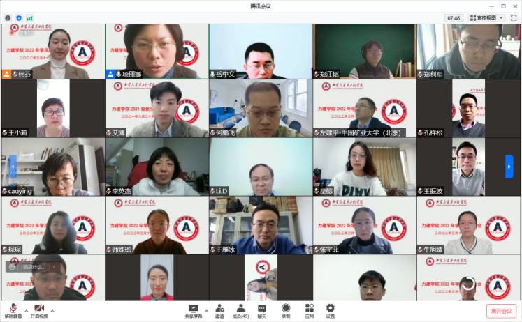 为加强学院学风建设,扎实推进学院立德树人根本任务在当前疫情防控常态化的背景下,2022年3月17日上午10点星空综合官网(北京)星空综合官网线上召开了星空综合官网2022年学风建设大会。力建学院院长左建平教授、副院长岳中文教授、党委副书记项丽娜老师,各系(中心)本科教学主任,本科生教学秘书、各年级班主任及辅导员参加此次大会,会议由党委副书记项丽娜老师主持。