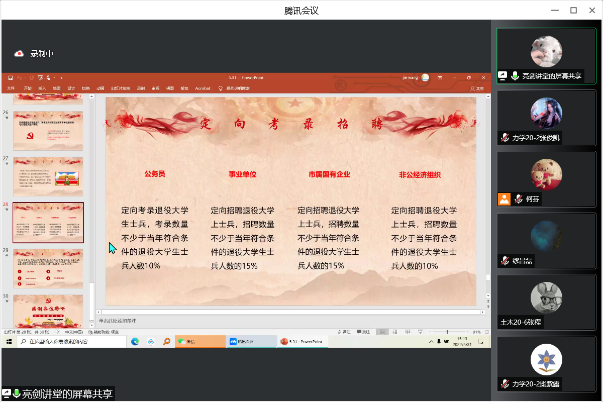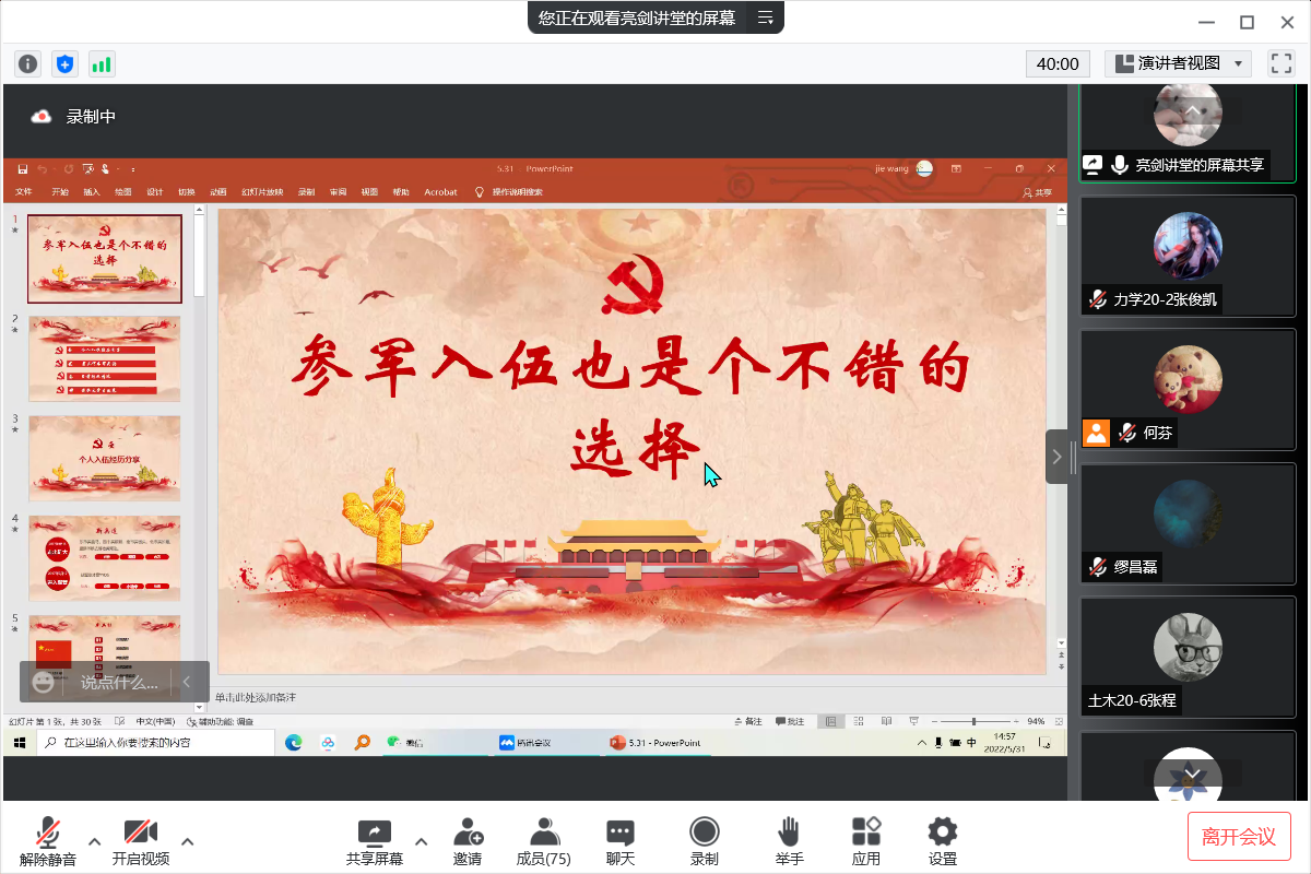 紧接着,曾参军入伍的王杰学长就大学生参军展开讲述。他首先分享参军入伍的经历,讲述退伍大学生的各项优惠政策;其次立足于当前的社会形势,讲述当前的就业情况以及一些行业的状况。他用亲身经历告诉我们,参军入伍也是个不错的选择。