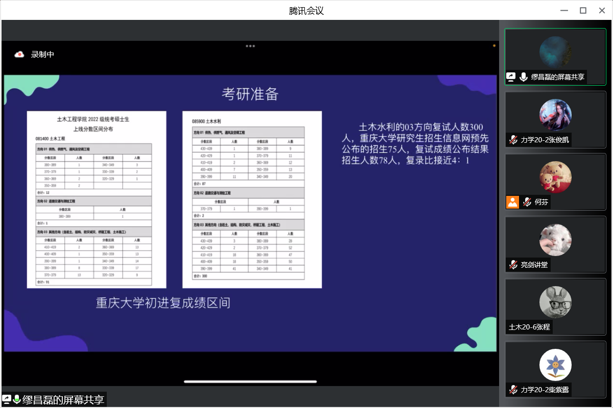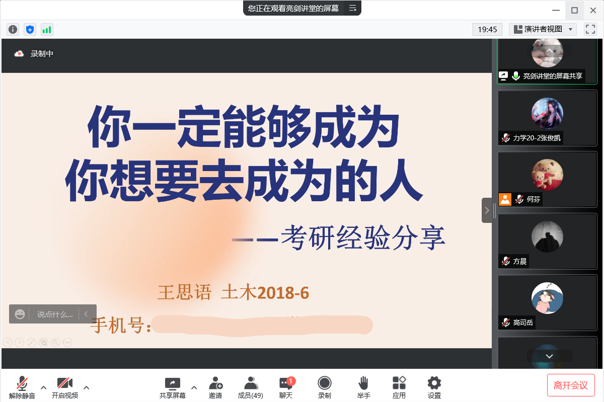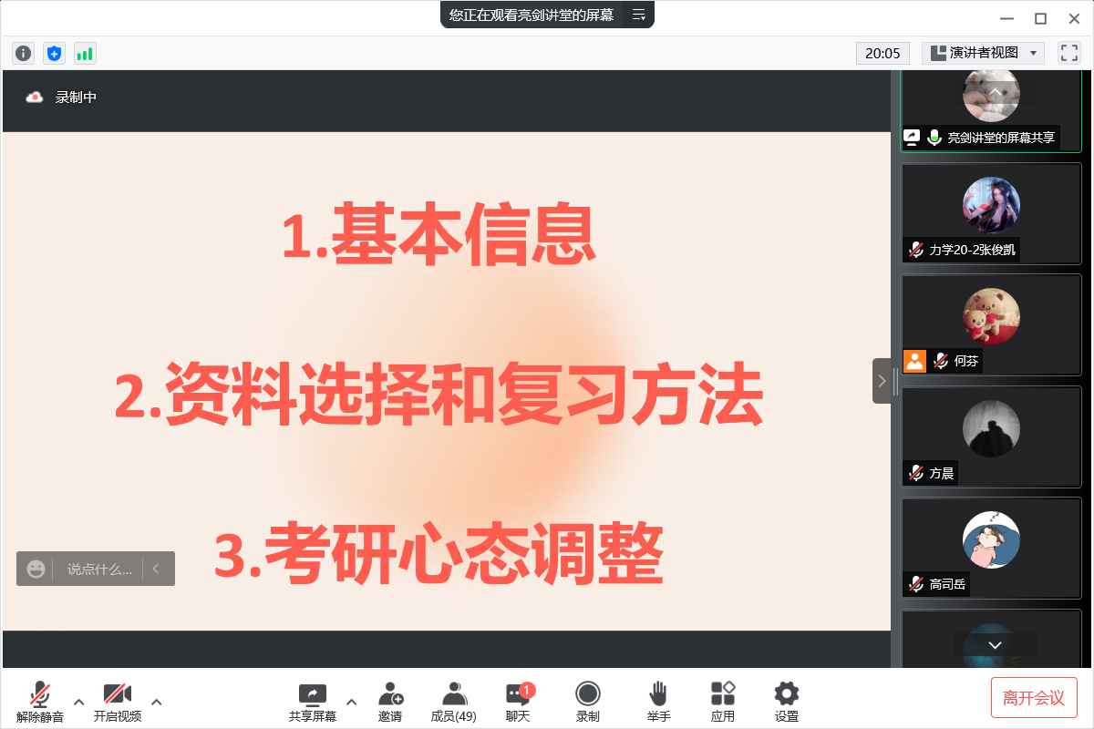 随后,进行分享的是考入重庆大学航空航天学院机械专业的缪昌磊学长。他介绍了如何准备考研初试的基础上,又讲到了关于复试和调剂的问题。他强调复试的时候心态一定要平稳,努力回答面试老师提出的问题,复试老师们都是很和蔼的,不要过于畏惧,以免心态上出问题。