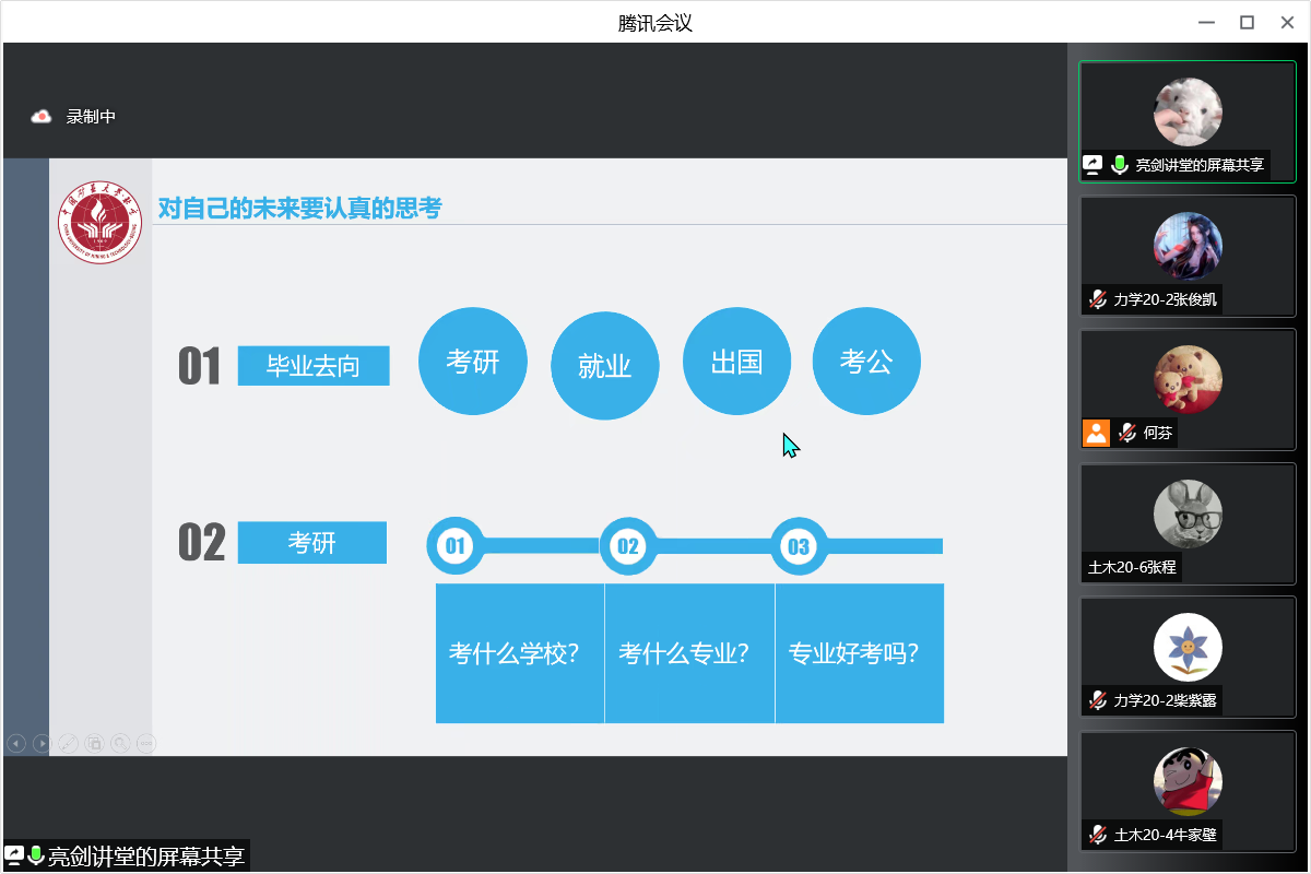 这次讲座,解决了很多同学们对于升学、就业和留学等方面的一系列问题,也使得同学们对自己的奋斗目标有了更清晰的认识。我们要正确的认识自己,做好规划,确立目标,脚踏实地,努力拼搏,充分实现自己的人生价值,为祖国建设的新征程贡献自己的力量!
