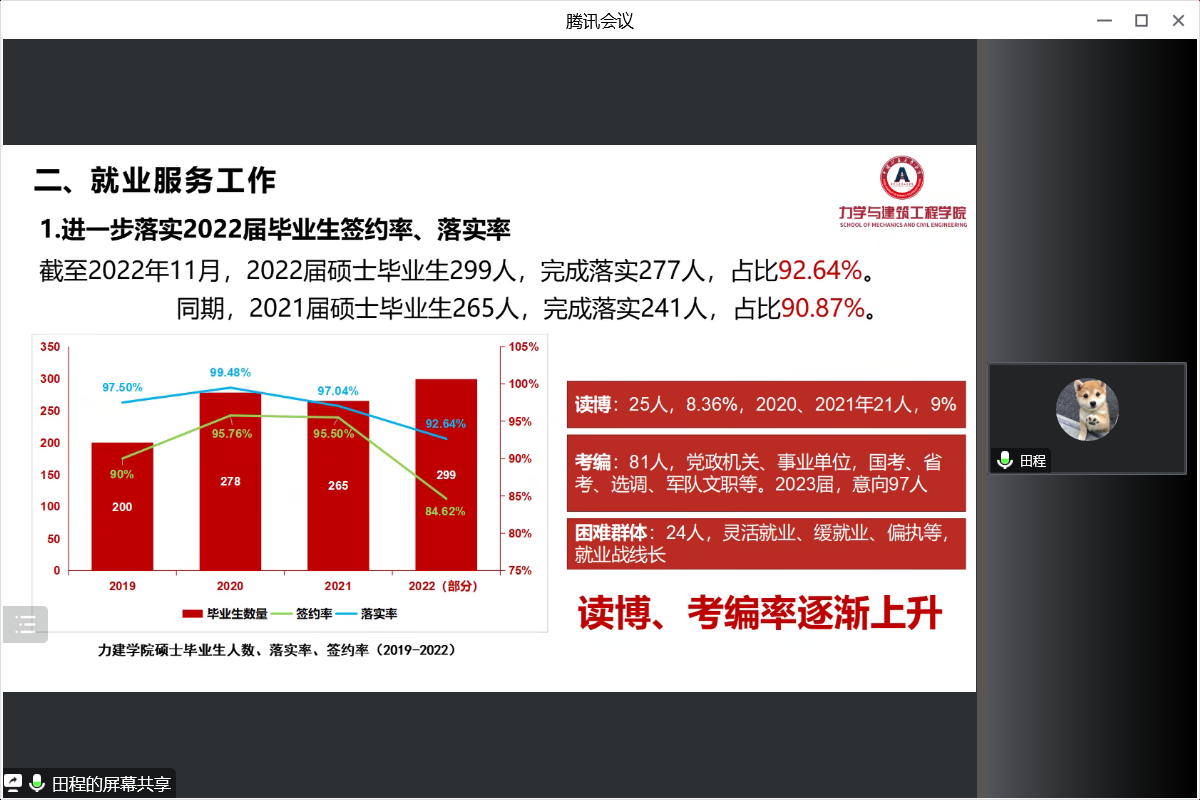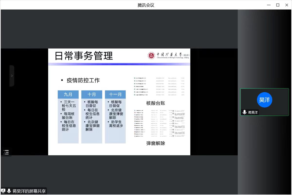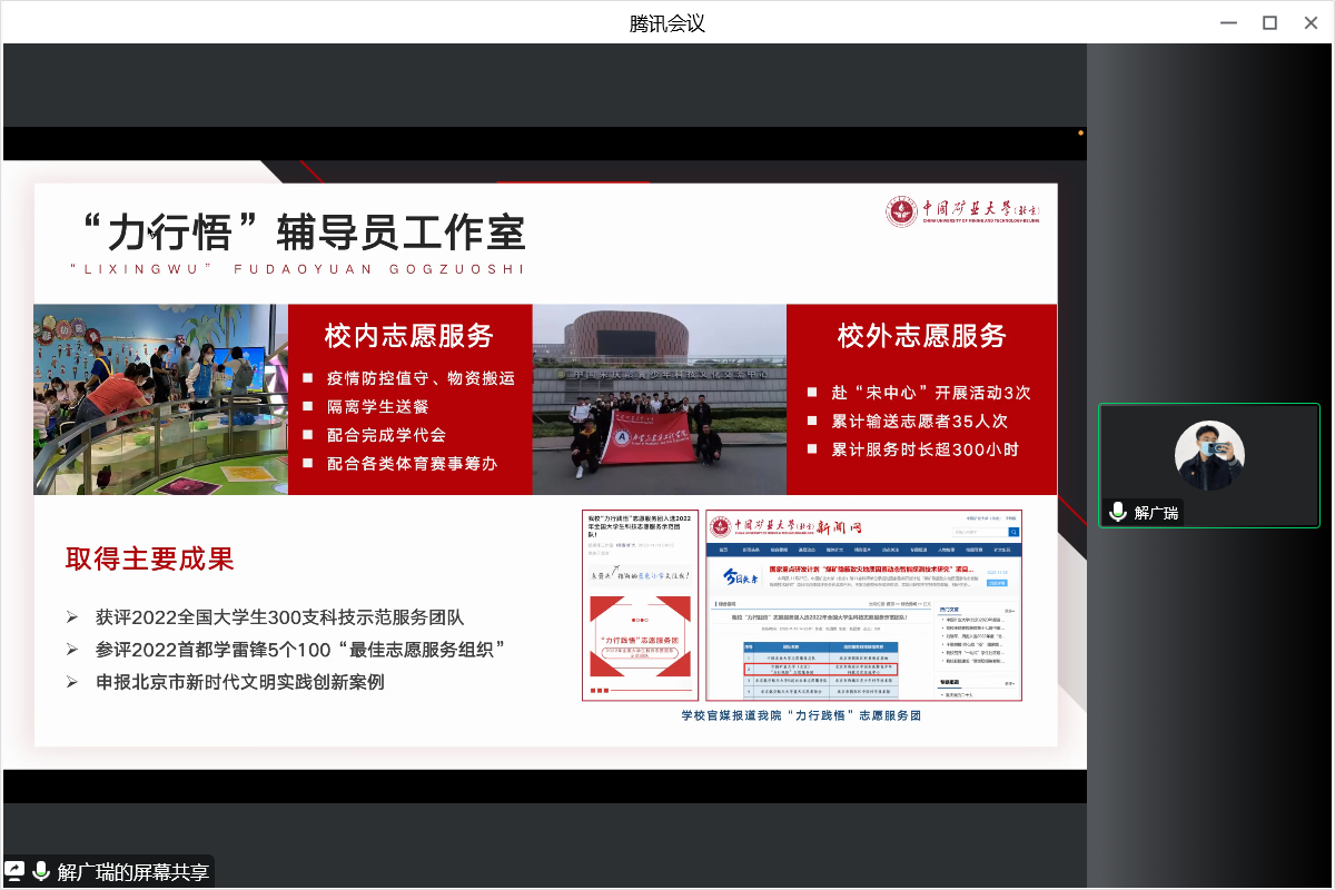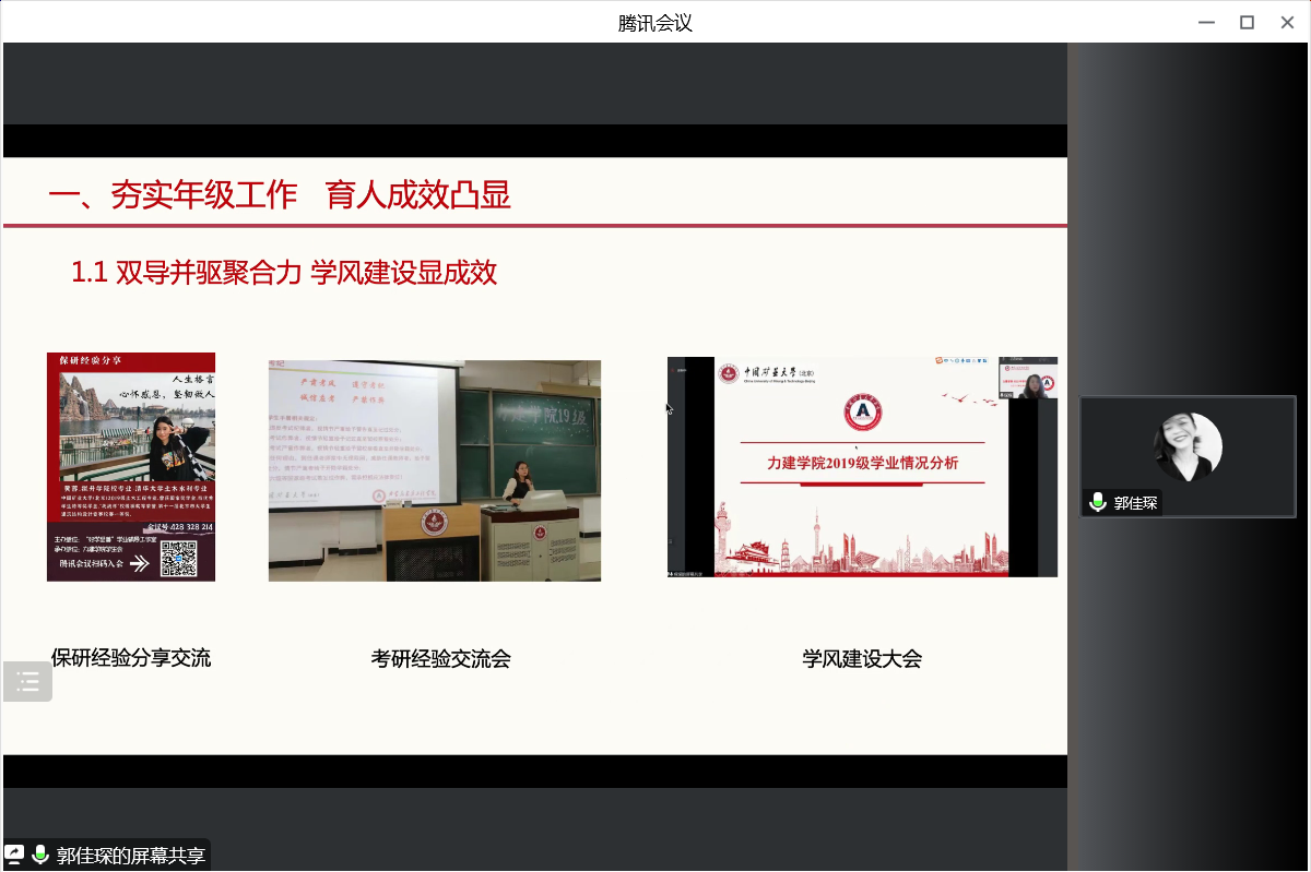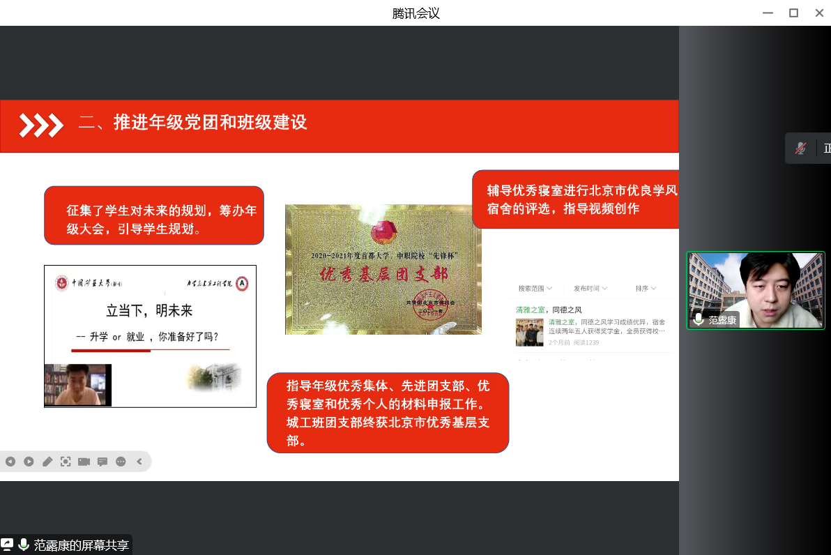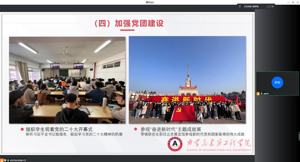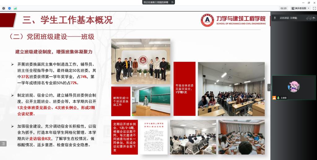 会上,力建学院11名专兼职辅导员从思想政治教育、党团班级建设、学风建设、日常事务管理、心理健康教育与咨询、网络思想政治教育、校园危机事件应对、职业规划与就业创业指导、校园疫情防控和所负责专项工作板块等方面进行了量化总结、难题分析和经验探讨,对工作的有效措施、显著成效、重点亮点等进行了梳理,总结分析本年度工作存在的不足和今后工作规划。