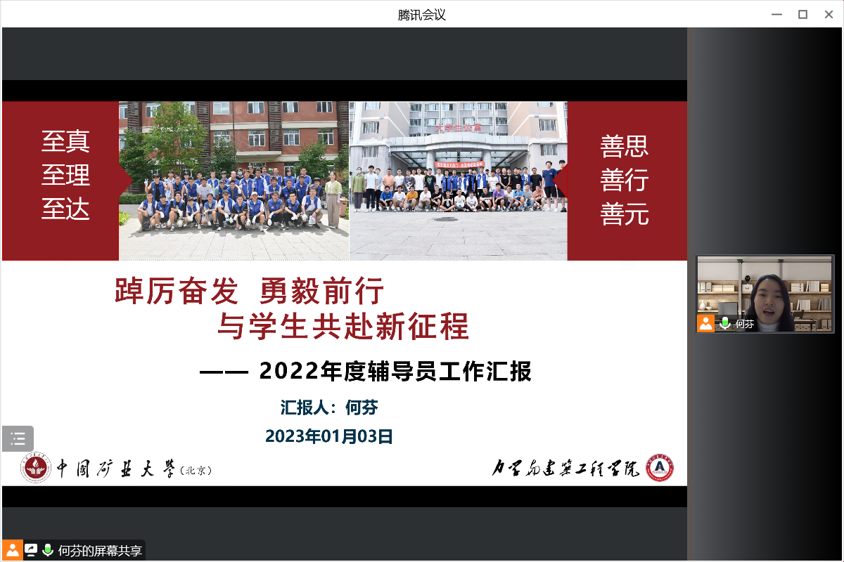 院党委副书记项丽娜认真听取了辅导员们的汇报分享情况并做总结讲话。她充分肯定了星空官网全体辅导员老师过去一年的辛勤工作和育人成绩,尤其在打赢高校防疫攻坚战中所做的贡献。项书记指出星空官网辅导员队伍是一支有活力、有动力、有效力、有聚力的队伍,同时对接下来的工作提出三点要求:第一,找准工作方向,各位辅导员对照《星空综合官网(北京)2023年工作要点》,继续做好学生成长成才的引路人。第二,明确工作定位,充分发挥学生工作教育、管理、服务的职能,不断提高辅导员专业化职业化建设。第三,凝练工作特色,做好日常工作素材积累,牢牢把握特色和成果两个工作抓手,将个人特色与专项工作相结合,凝练工作成果。