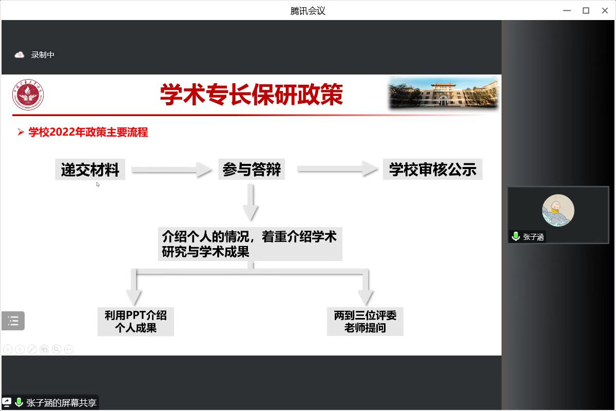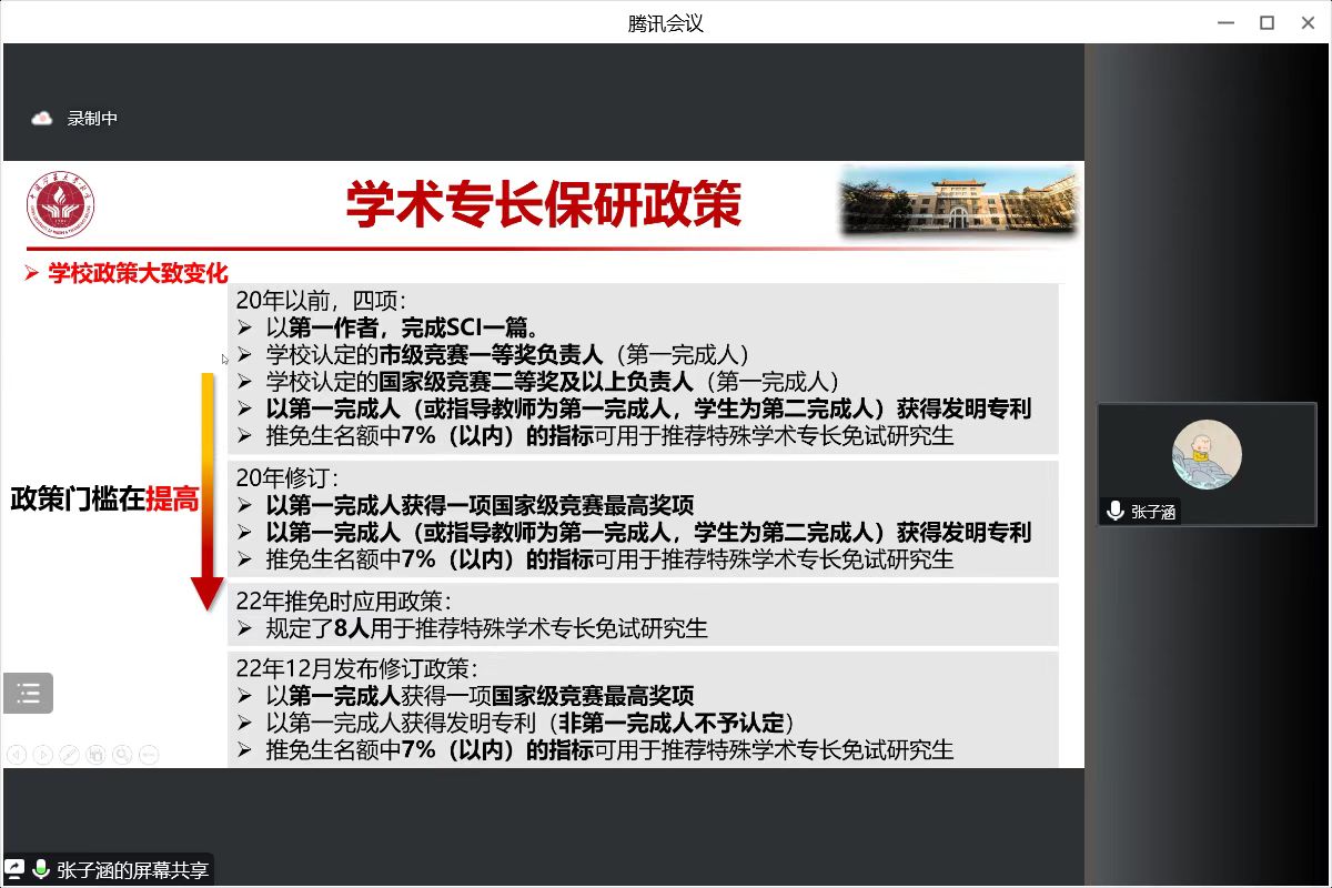 张子涵从自身经历出发,介绍学术专长的保研政策,为同学们分析近几年学术专长保研政策的变化,强调要仔细研读政策,并做出对应的准备。针对学术专长保研过程中科研和期末考试冲突的问题,强调保研是个持久战,要平衡好学习、科研和生活。