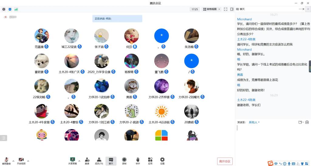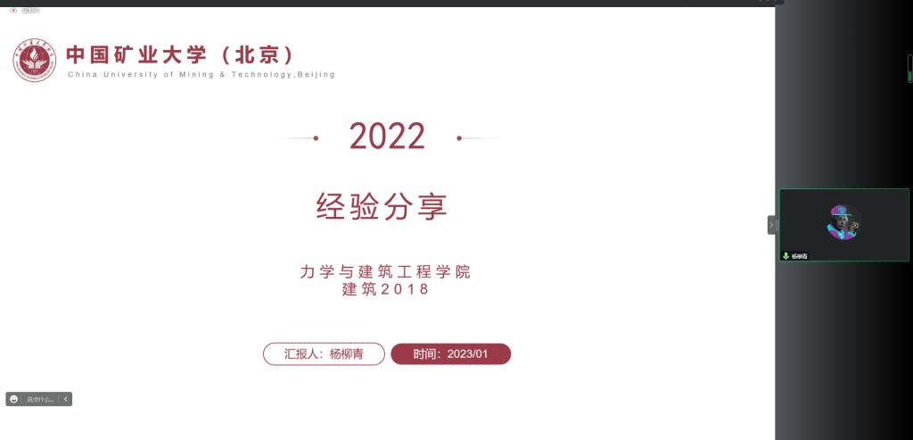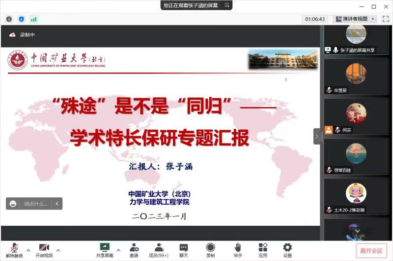 为加强学院学风建设,积极引导同学们做好保研相关准备事项,深入了解保研知识,明确学习方向,帮助同学们充分了解本专业推免情况,星空官网于1月4日下午15:00线上举办亮剑讲堂——优秀朋辈榜样保研经验分享专场讲座,特别邀请星空官网2023届四名优秀保研学子做专场讲座,他们分别是拟推免至中国科学院力学研究所力学专业的工程力学专业19级张砚龙、拟推免至清华大学土木水利专业的土木工程专业19级黄蓉、拟推免至东南大学智能设计与先进建造专业的建筑学专业18级杨柳青、拟推免至中国科学技术大学工程科学学院近代力学系的城市地下空间工程专业19级张子涵。累计120余名同学线上参加讲座,讲座由学院团委副书记何芬老师主持。