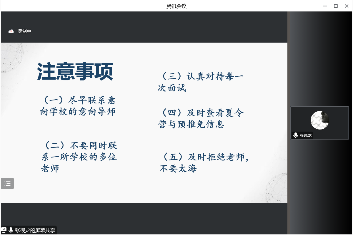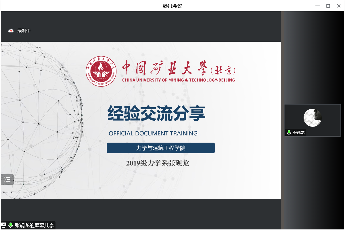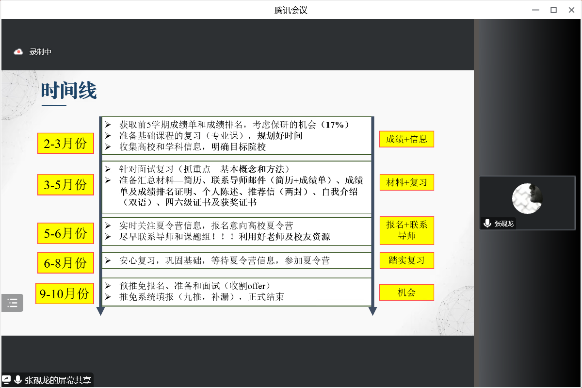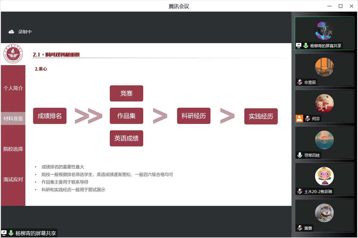 张砚龙主要从个人简介、推免情况、科研经历、制作简历四个方面进行经验分享,他向同学们介绍19级力学专业的推免情况,讲解制作简历的技巧,分析保研的时间线,并结合自身面试情况,讲述在面试中应注意的问题。其次针对科研竞赛,指出同学们要积极主动参与大创,争取寒假期间开始论文撰写或专利申请的工作,积极参加具有科研性质的竞赛。