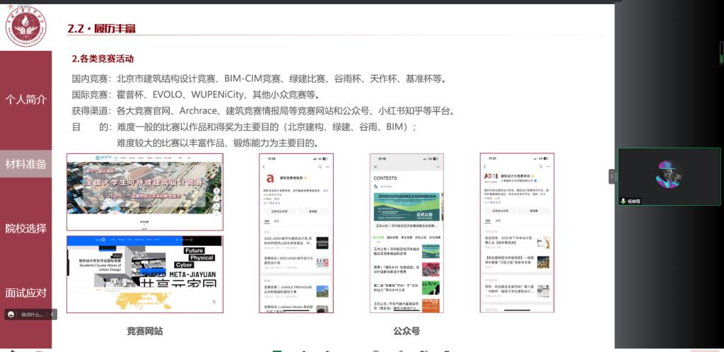 杨柳青主要结合建筑学专业的专业特色,介绍了建筑专业的学生在保研推免过程中需要注意的相关事宜。他从个人简介、材料准备、院校选择、面试应对四个方面进行分享,并分享相关国内竞赛和国际竞赛的参加渠道。他指出成绩排名在保研中很重要,同学们要注重提高自己的学习成绩。