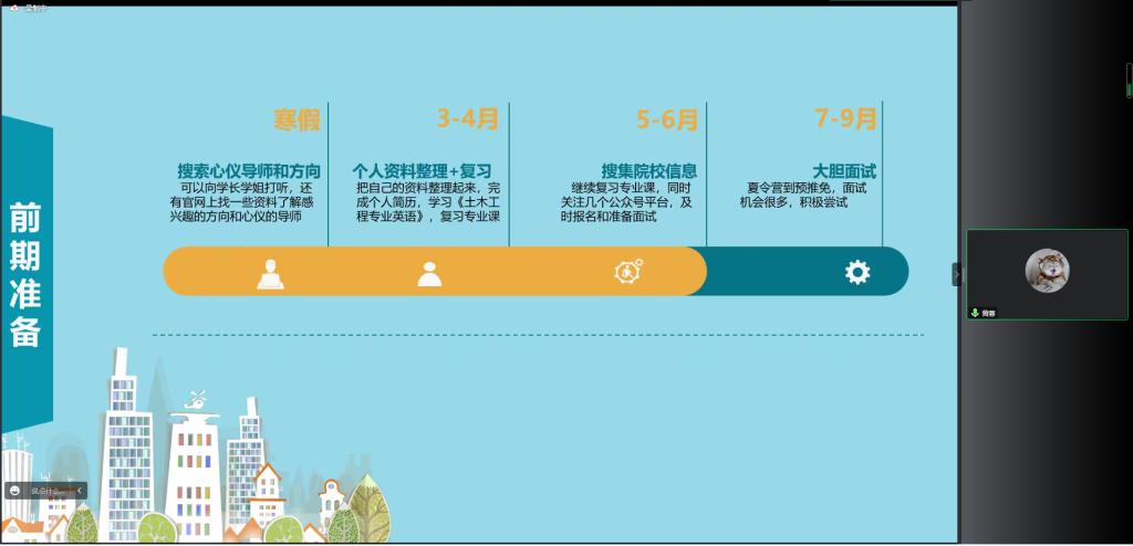 黄蓉主要介绍了土木工程专业的推免准备相关事宜,以及在夏令营和九月预推免过程中的情况。在准备时间线方面,她指出要尽早探索心仪方向和导师,可以咨询往届学长学姐,也可以去官网上查询。她结合自身保研推免经历提醒同学们,在推免过程中要勇敢、变通、积极,多和周围同学交流心得。
