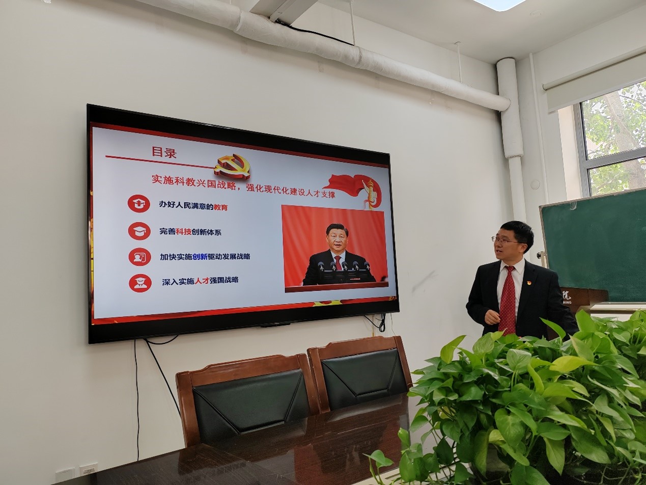 左建平院长详细解读了习近平总书记关于教育、科技、人才的重要论述。他指出,党的二十大报告把科教兴国、人才强国提到了全所未有的高度,为新时代我国教育发展、科技进步、人才培养指明了前进方向,提供了根本遵循。左建平院长分别从办好人民满意的教育、完善科技创新体系、加快实施创新驱动发展战略和深入实施人才强国战略四个方面展开解读。他强调,我们要在以习近平同志为核心的党中央坚强领导下,坚持以习近平新时代中国特色社会主义思想为指导,牢记总书记殷殷嘱托,坚定历史自信,保持战略定力,发扬斗争精神,勇于攻坚克难,不断提高推动高质量发展的本领、在新征程上为教育事业做出贡献。