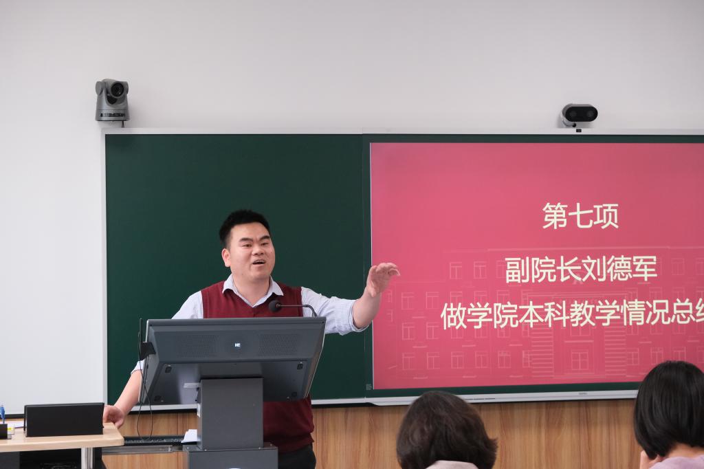 副院长刘德军做本科教学情况总结。他指出当前学生存在考试基础知识掌握不扎实、高年级学生课堂出勤率不高、学生考试违纪情况严重等问题。他强调,任课老师要适当更改工作方式,提高教学质量,适应时代发展。他指出,加强学风建设需要靠各方的共同努力,学院要加强“双导并驱”工作,深度了解学生帮助学生。
