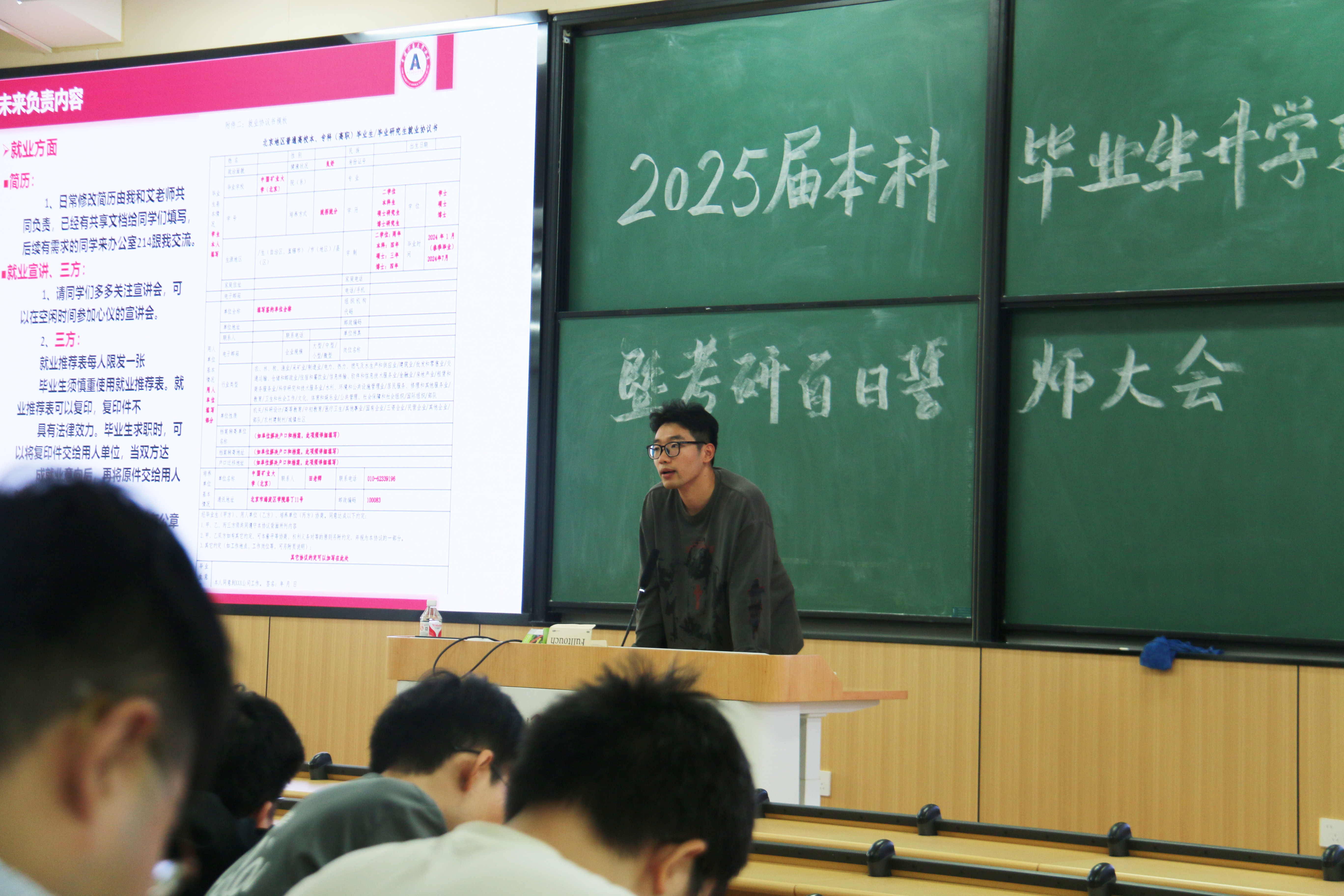 张克涛向同学们讲解日常管理,通过剖析大四的相关工作、解读就业中的误区、强调后续三方的签约流程和注意事项,来让同学们对自己的前途有了更加清醒的认识。