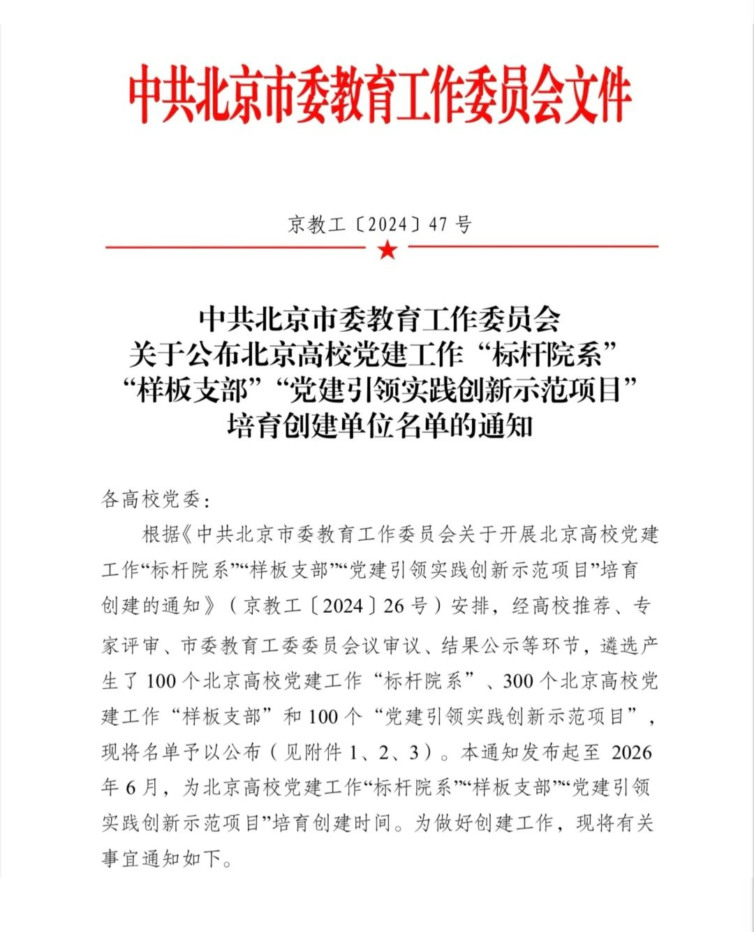 近日,北京市委教育工委下发了《关于公布北京高校党建工作“标杆院系”“样板支部”“党建引领实践创新示范项目”培育创建单位名单的通知》,经高校推荐、专家评审、市委教育工委会议审议、结果公示等环节,遴选产生了100个北京高校党建工作“标杆院系”、300个北京高校党建工作“样板支部”和100个“党建引领实践创新示范项目”。