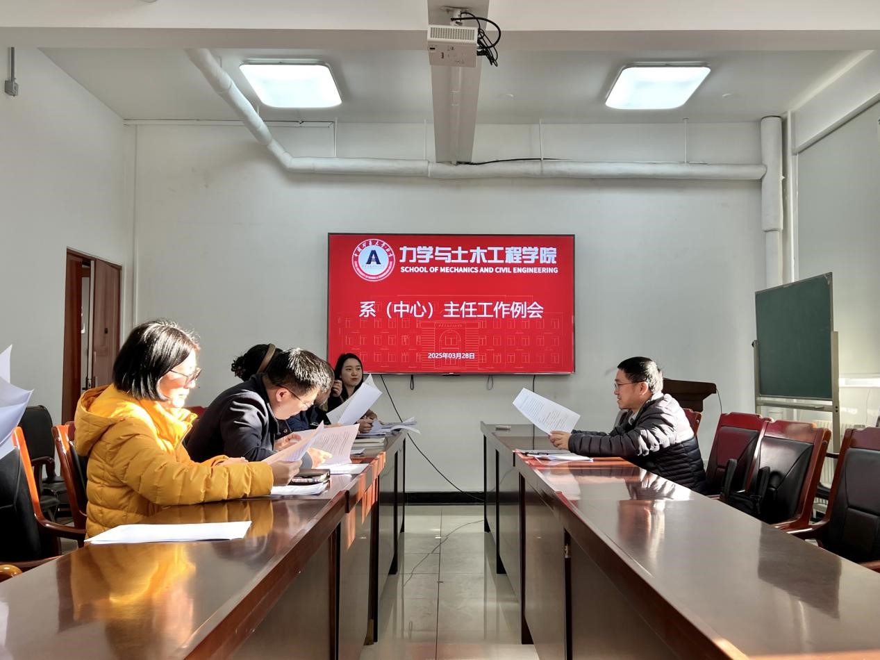 2025年3月28日下午,学院在力建楼222会议室主持召开系(中心)主任工作例会。学院院长左建平出席会议,工程力学系主任李明耀、建筑工程系主任赵卫平、建筑系主任贺丽洁、工程实验中心主任张小燕、城工系副主任武海鹏、岩土系党支部副书记徐薇参加会议,会议由办公室主任何芬主持。