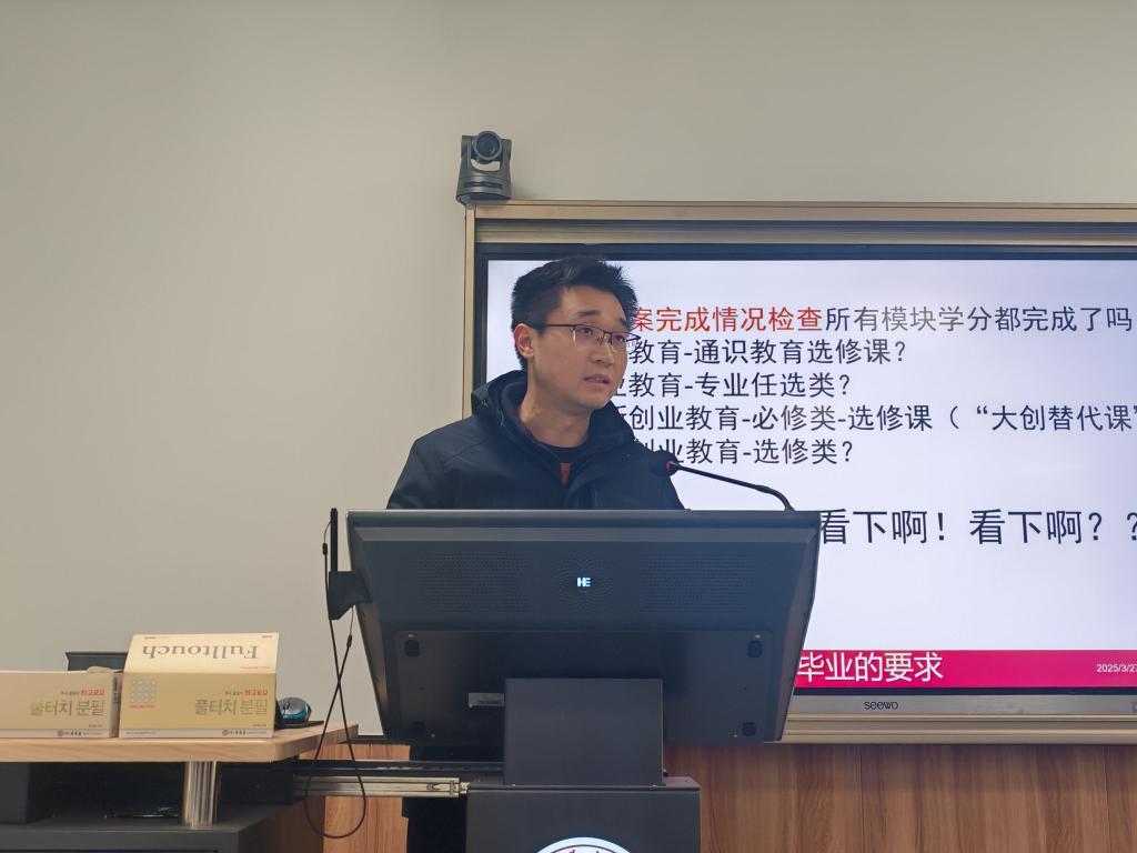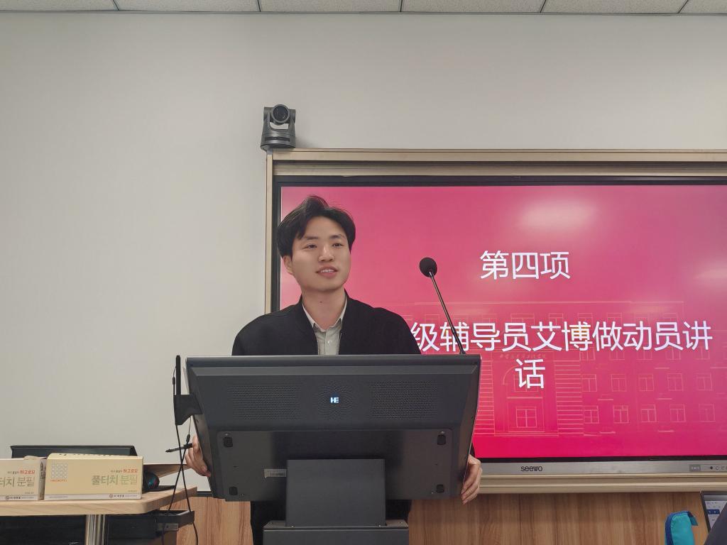 艾博老师以"态度·信心·成长"为主题作工作部署。他充分肯定与会同学的积极态度:"能够来参会本身就展现了直面难题的勇气”。他结合目前2025届本科毕业生学情和就业现状,分析和提出应对策略,指导同学们一要提高认识和重视、积极端正态度,二要明晰自身形势、制定可行方案,三要敢于主动出击、合理规划安排,四要坚定决心信心、携手共克难关。他要求班级主要党团班干要积极行动起来,和学院一道帮助身边困难同学顺利完成学业和实现充分升学就业,共同收获圆满的大学生涯。作为学生最亲的人,他勉励大家:"学院老师将全程陪伴和努力,帮助同学们跨过这道关卡。"
