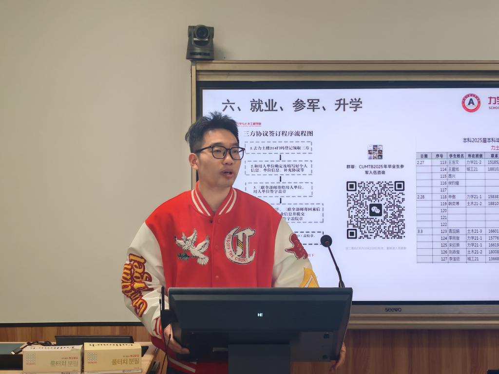 为切实做好毕业季学业帮扶与就业指导工作,落实立德树人根本任务,力学与土木工程学院于3月27日下午在教学楼218组织召开"2025届本科毕业生学业就业重点群体帮扶指导会"。本次会议由学院党委统筹部署,院党委副书记项丽娜莅临指导,本科教学秘书徐志超,院党委专职组织员、2021级辅导员艾博,2021级辅导员张克涛,各班级主要班委、重点帮扶毕业生共60余人参会。会议由张克涛主持。
