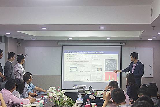 详细介绍了岩石动力学1995年到2019年各阶段的研究历程及目前在岩石动力学方面的重点难点,让我们对岩石动力学过去、现在及将来的研究有了一个全面的认识。介绍了高速声发射预测岩爆的相关内容,如详细介绍了其实验设备,其拥有先进的数据采集系统:硬件和软件方面。同时又介绍了高速摄像机的3D-DIC系统、连续声发射传感器及波发生器和超声传感器的功能、使用方法及数据结果。同时张乾兵老师也详细介绍了数值模拟在岩石动力学中的应用,比如基于离散元方法对岩石压裂行为的建模过程及实验分析和岩石在宏细观下的破坏机理。分析了岩石材料在不同应变率情况下的变形行为,进行了详细的数据分析和机理研究。会后师生与张乾兵老师就岩石动力学和霍普金森压杆的相关内容展开了热烈的讨论。