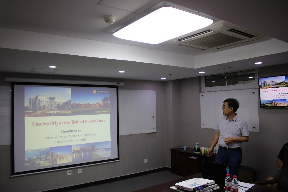 2019年9月26日,澳大利亚科廷大学卢春生副教授来我校访问,并做了题为:Unsolved mysteries behind power-laws的学术报告。幂律分布可以从简单的模型和直观现象中生成,然而,理解它们的起源、意义和跨学科的共性仍然是许多科学领域的一个开放性问题。卢老师首先引入了大自然中与幂率相关的统计曲线,然后引出幂率的概念,最后将岩石力学问题与幂率相结合。卢老师的报告深入浅出,引人入胜,系统论述了一种力学数据分析的新方法。同时卢老师也讲述了幂率曲线目前面临的难点和发展方向,让一些对幂率感兴趣的同学得以清楚明了的找到研究的方向。随后卢老师对科廷大学留学的相关政策进行了解读,并认真详细回答了老师和同学们的问题。