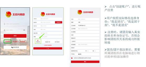 (4)点击“创建账户”,进行账户注册。用户按照实际情况选择身份:“我是团员”、“我是团干部”、“我不是团员”。注册时,请团员输入真实的姓名和身份证号,否则会影响团组织关系的成功转接转接。