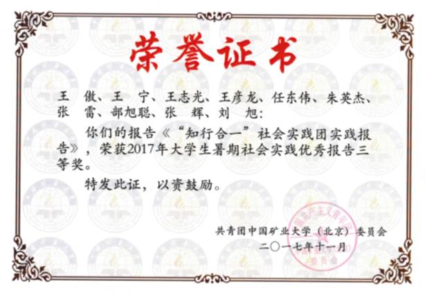 王彦龙同学2017年大学生暑期社会实践优秀报告三等奖荣誉证书