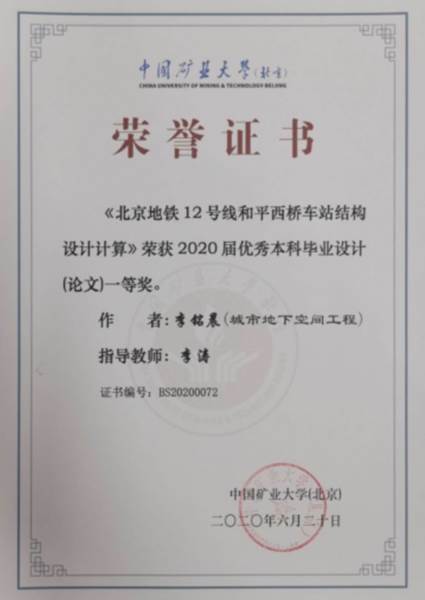 李铭晨同学2020届优秀本科毕业设计(论文)一等奖荣誉证书