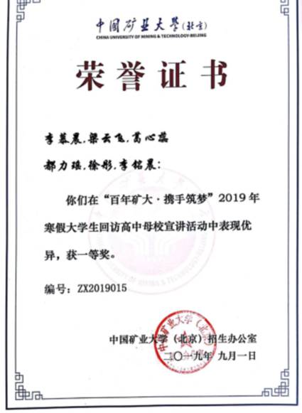 李铭晨等同学“百年矿大,携手筑梦”实践活动一等奖荣誉证书