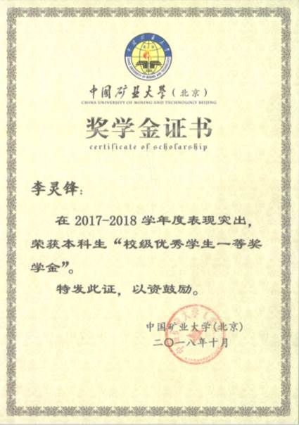 李灵锋同学2017-2018学年校级优秀学生一等奖学金证书