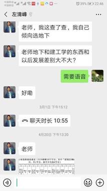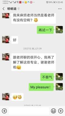 梁谷平同学感谢学校安排的本科生全程导师制,让自己获得了最全面的指导,他深深感受到来自母校的关爱,更是感谢自己本科生导师吴丽丽老师。