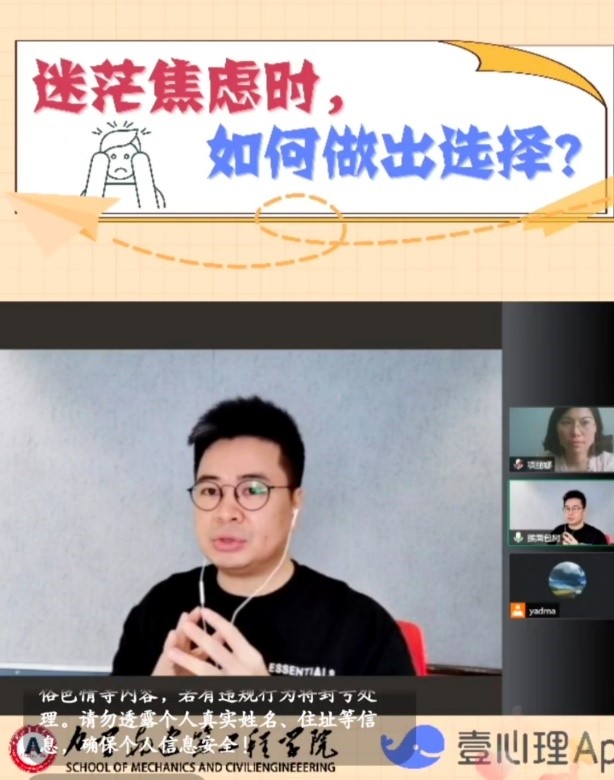 本次讲座过程,黄伟强围绕主题“迷茫焦虑时,如何做出选择”展开直播互动,通过三个关于选择的故事,向同学们详细讲述在人生重大或者艰难的时刻要选择听从内心的声音,而非噪音,让学生不再迷茫焦虑。他说道:“人往往会在人生重大的或者艰难的时刻做出趋利避害的选择。因此,我们不能因为别人的建议和所受的压力来做决定,而要取决于我是什么样的人,我想要什么,我的价值观是什么。”同时,黄伟强也结合自身经历给予了处在后疫情时代欲选择“躺平”的迷茫、焦虑的大学生们一定的建议。
