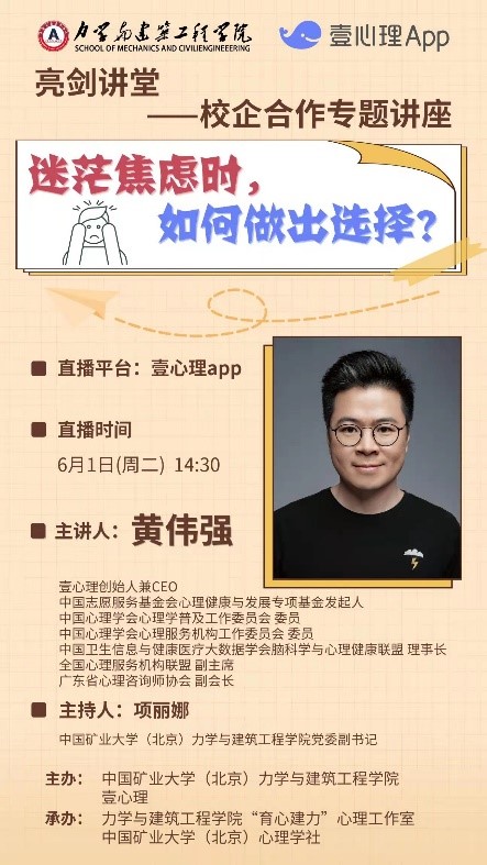 2021年6月1日14:30,星空综合官网联合壹心理举办了“亮剑讲堂之校企合作专题讲座”。星空官网“育新建力”心理工作室和心理学社特别邀请了壹心理创始人兼CEO黄伟强为星空官网师生做主题为“迷茫焦虑时,如何做出选择”的线上直播。讲座由星空官网党委副书记项丽娜老师主持,观看直播人数达2000人。