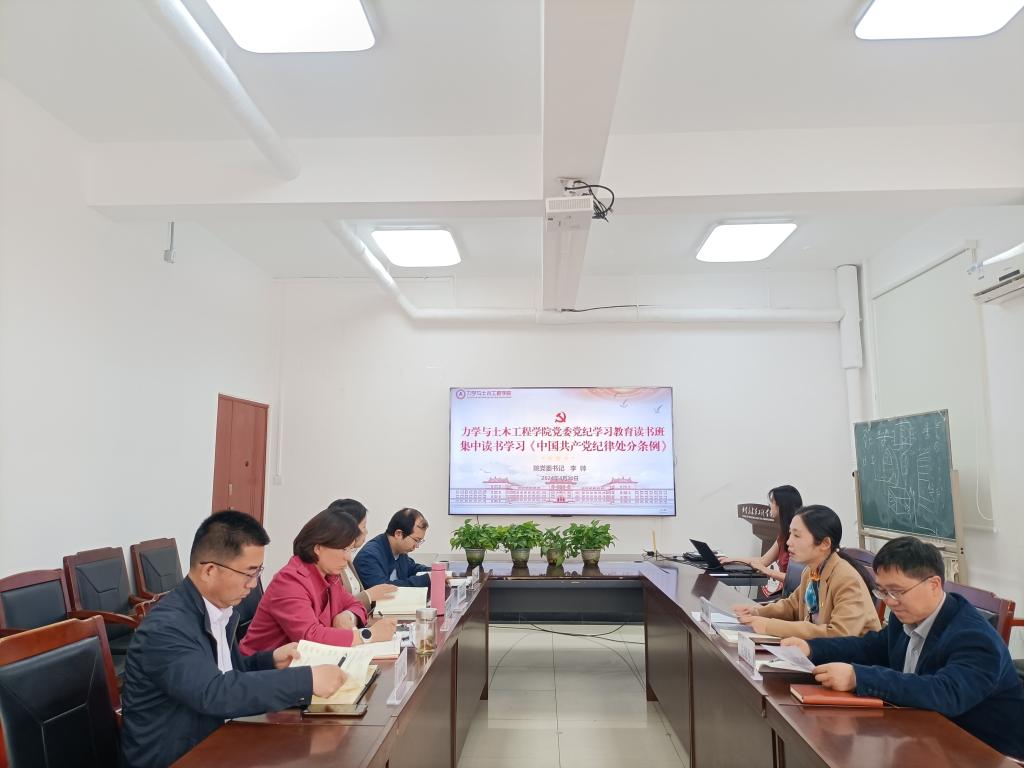 为深入学习贯彻习近平总书记关于党纪学习教育的重要讲话和指示精神,认真学习新修订的《中国共产党纪律处分条例》(以下简称《条例》),根据学校、学院党纪学习教育总体安排,4月30日上午,力学与土木工程学院党委党纪学习教育读书班在力土楼222会议室开班。院党委书记李帅主持并作第一讲领学,院领导班子、党委委员、专职组织员参加学习。
